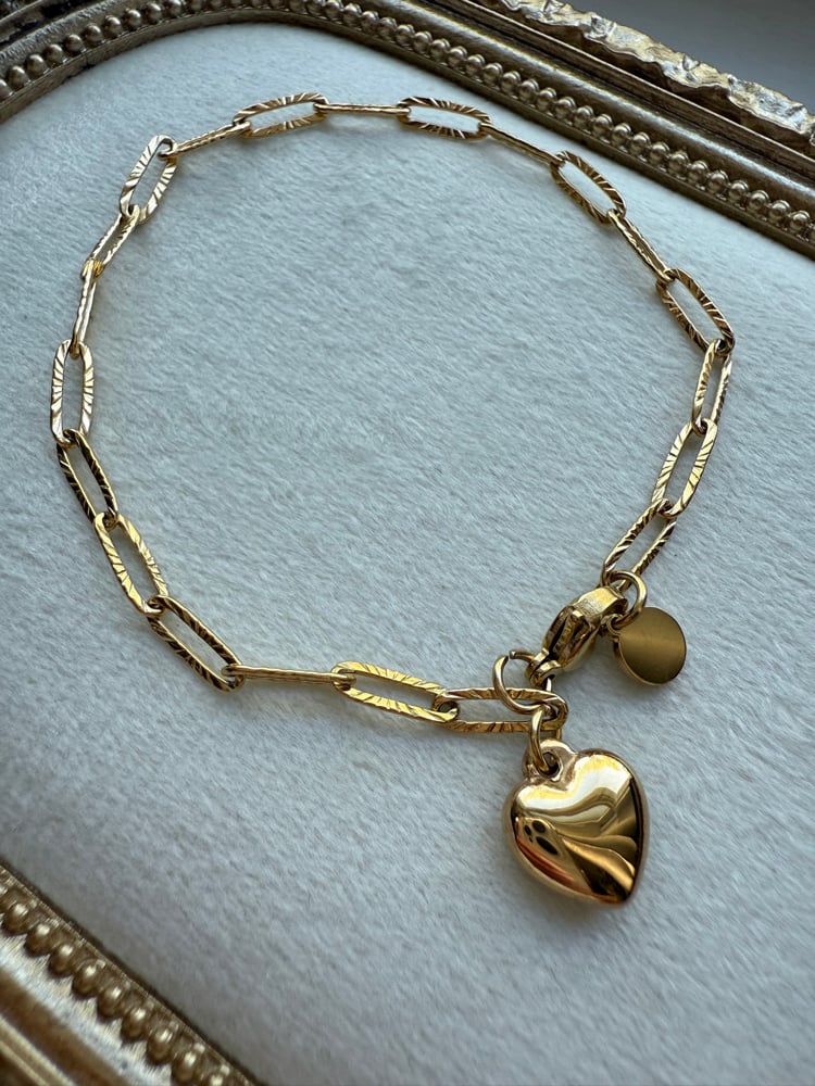 The Amore Bracelet is a timeless piece crafted in stainless steel with an 18k gold finish. Its textured chain links catch the light beautifully, while the polished heart charm adds a romantic touch. Tarnish-resistant and durable, this bracelet is designed to be an everyday staple with a hint of elegance.